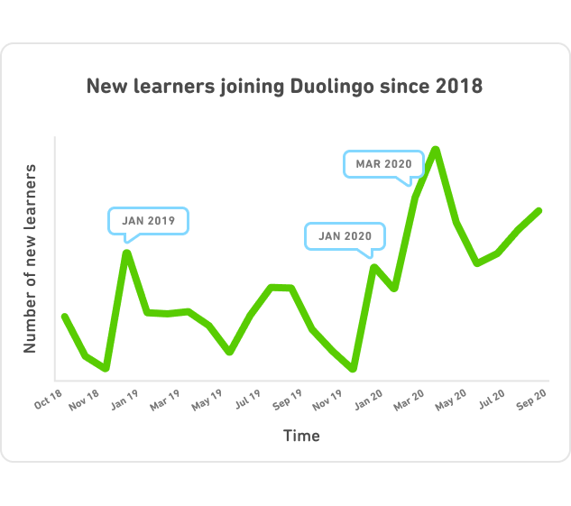 - 30 million new people took up language learning during the lockdown. The biggest spike was seen in March 2020. The increase in learners in each country was directly linked to the time when the country announced their lockdowns. China saw the first wave of new learners, when they locked down on February 20th, with waves of new learners joining the platform each week, with a massive increase of 300% in March and April.